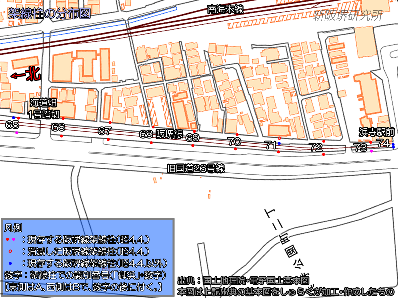 2. 浜寺駅前電停終点付近の南端2つの架線柱「御浜72B」と「御浜73B」が「旧26」の歩道を跨いでいること。