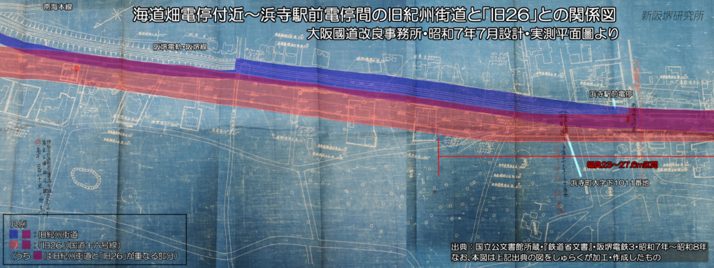 - 「旧26」は複線の路面軌道が敷設できるように幅員15間となったため、旧紀州街道の一部が「旧26」の歩道に組み込まれた。(この路面軌道は新阪堺電車・新阪堺線を想定したもの)